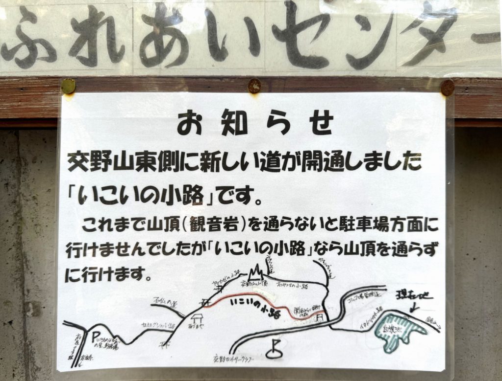 💠骨粗しょう症治療薬の副作用で大腿骨骨折が危惧された相方が、先日の整形外科受診で軽登山OKとのことで、さっそく枚方市津田へ…..当初は国見山・白旗池までと決め、急登の交野山山頂予定外だったが、センター掲示板の “交野山東側に新道「いこいの小路」" のお知らせを見て、ならば南側へ迂回して交野山山頂へと、予定変更。