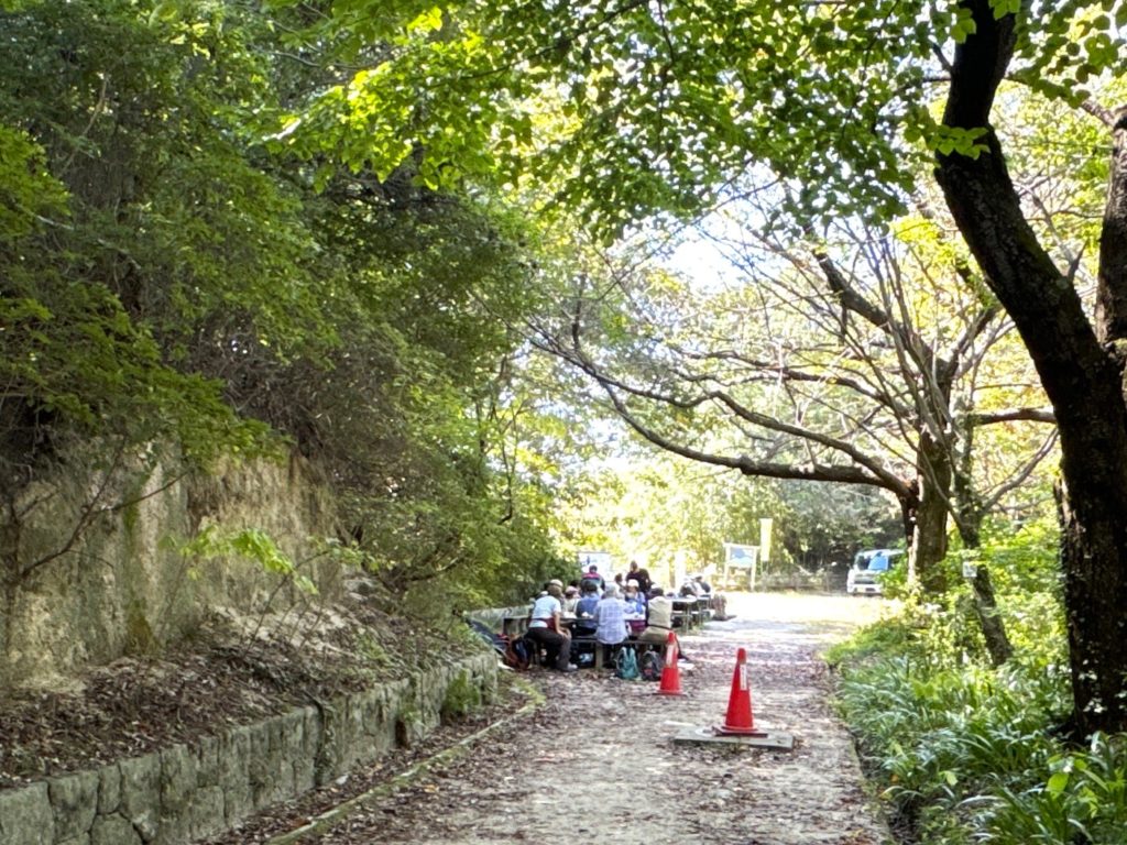 白旗池畔「交野市いきものふれあいの里」着…ベンチは手前も奥も満員…ふれあいセンター前へ戻ると、ちょうど空いたので昼食休憩🍙