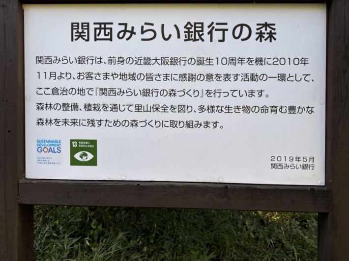 🔹交野カントリー倶楽部進入路の向こう、山頂への「オニヤンマの小路」…左側の木陰に「関西みらい銀行の森」の掲示…