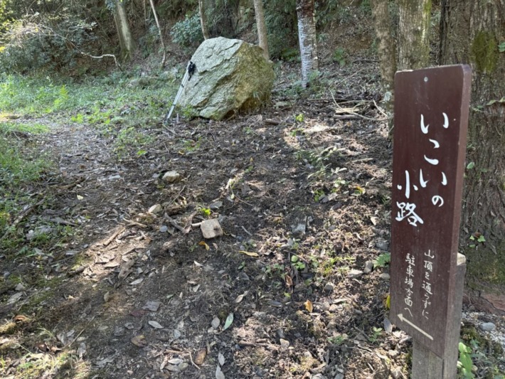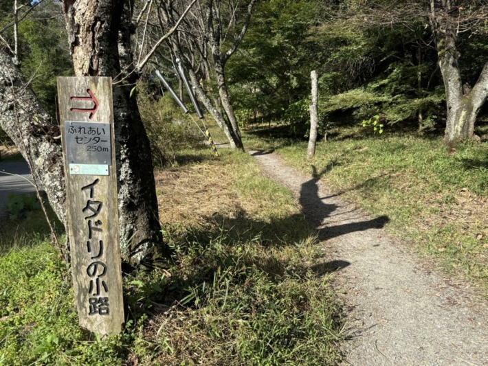 ゴルフ場進入路を横切ると、すぐに「いこいの小路」の掲示…
