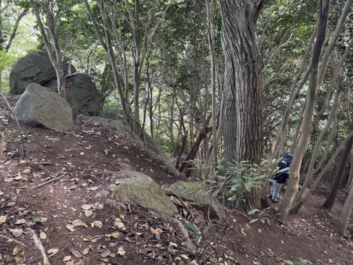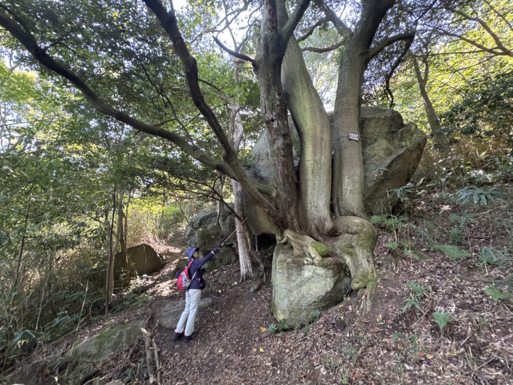大岩をせき止め食い込むように、奇異な根っこ姿の大木…名札にツブラジイ(円椎)