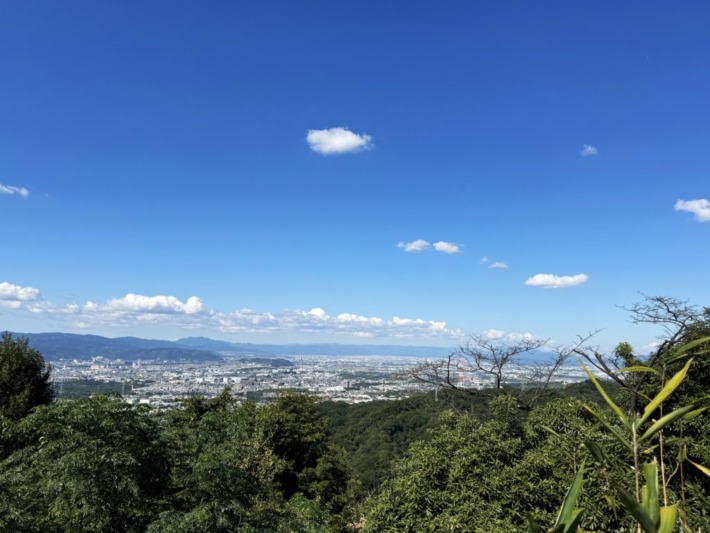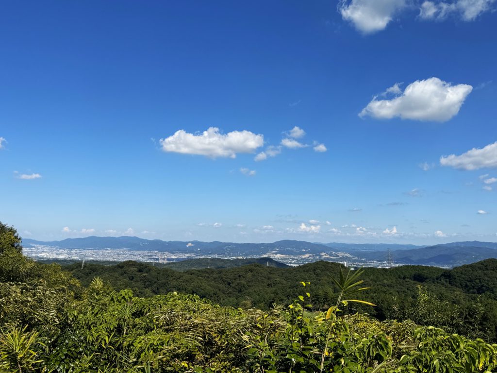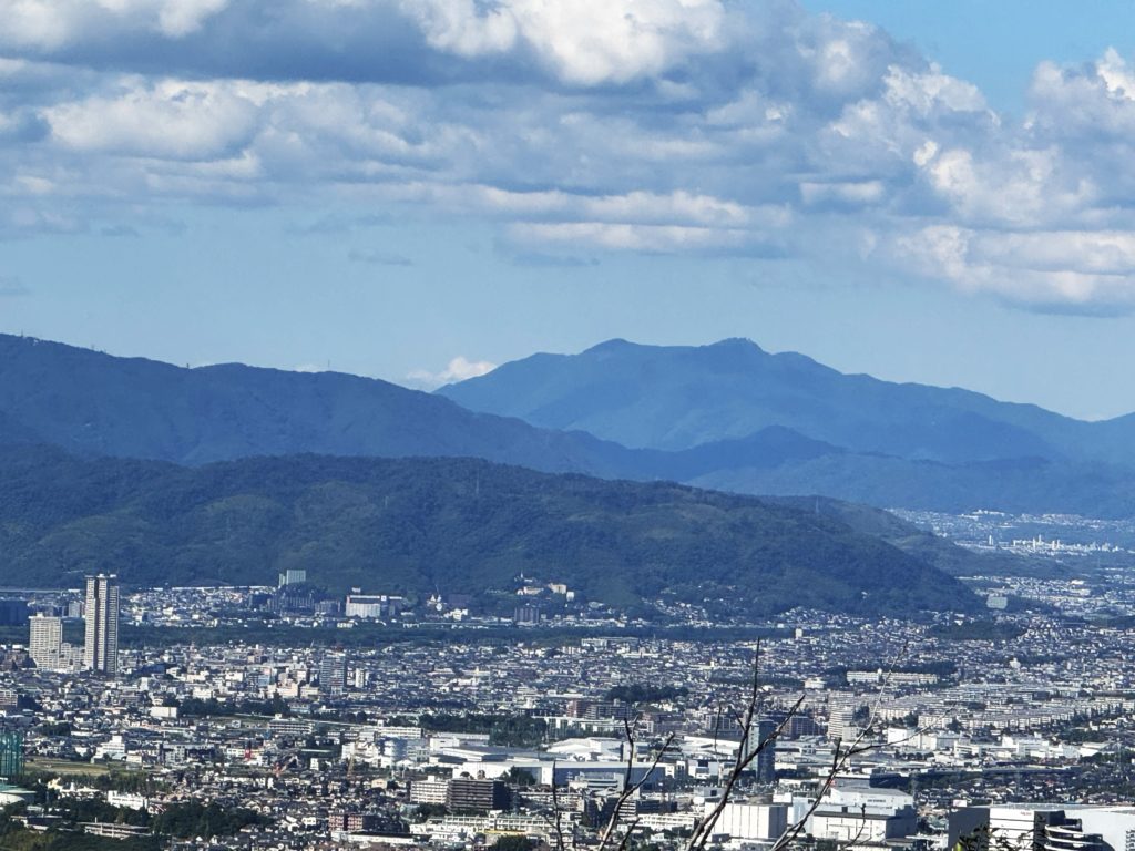 ぽっかり浮かんだワタ雲の下…北東側は城陽市から左手宇治・山科の街並み…牛尾山・音羽山からなだらかに低まった向こうは大津市(琵琶湖)