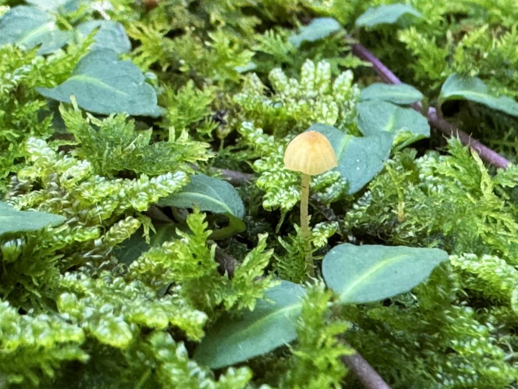 苔の間から姿をのぞかせたキノコ…高さ8mm位で水苔に生えるキミズゴケノハナ(黄水苔の花)のようだ…可愛い🤗