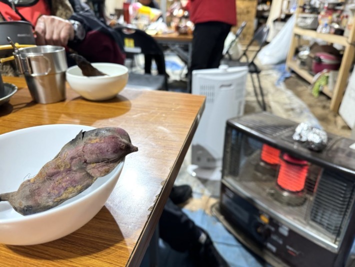 交流テント内では、男性が差し入れ?のお米でご飯を炊いた在り、女性は鍋をこしらえたり、お酒も入りそれぞれが夕食と懇談…ボラ先で頂いたのか、たくさんのお芋…ストーブで焼いて頂いた😋