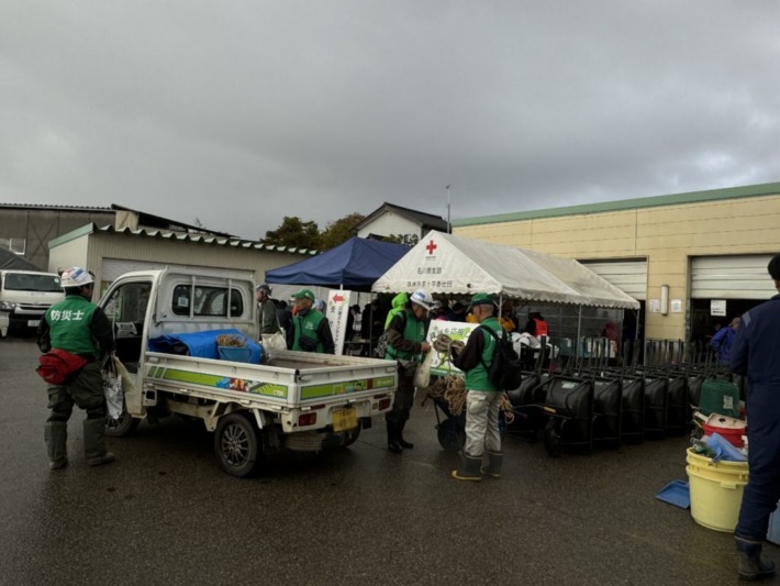奈良県防災士会の活動に参加するため、防災士会のビブスを着用し、Y氏と珠洲市災害ボランティアセンター 近くの体育館駐車場 へ…