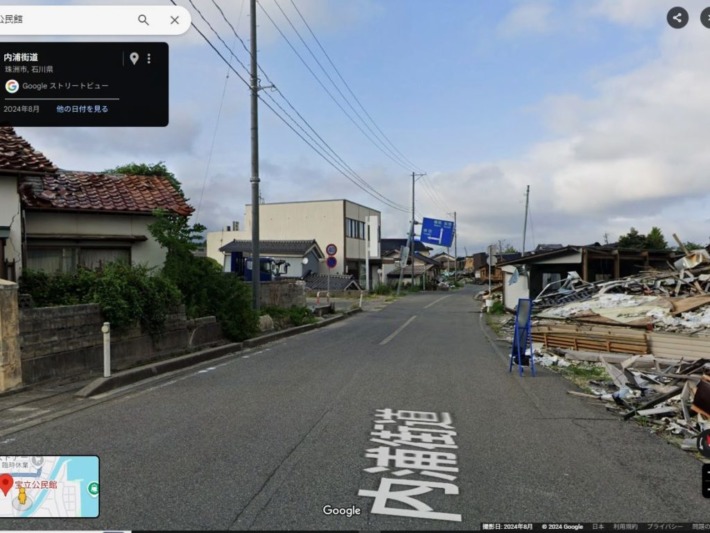 Google streetに戻すと、県道34号内浦街道の傾いた道路案内あたりの、被災後8月の状況が確認できる…そして、この時点では解体されていない様子….。