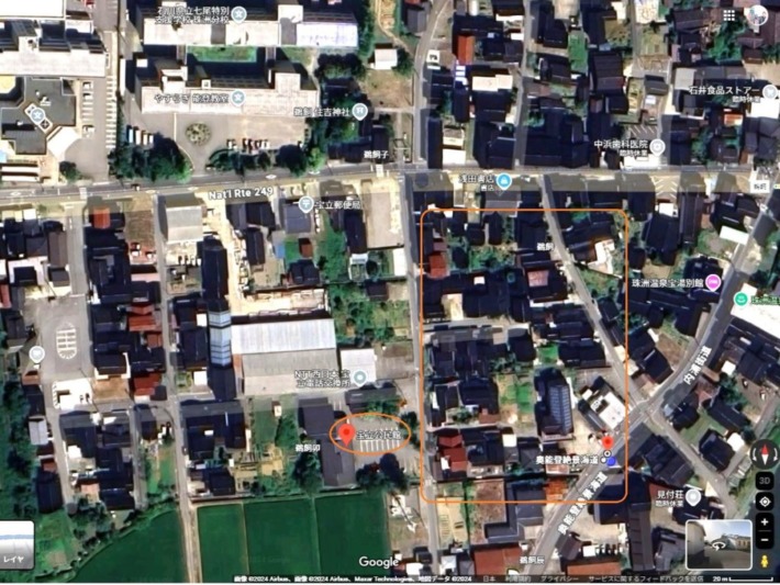 上記場所の被災前と被災後の状況がGoogle で確認できる。航空撮影では〇囲みの公民館前の□囲みエリアは被災前だが…