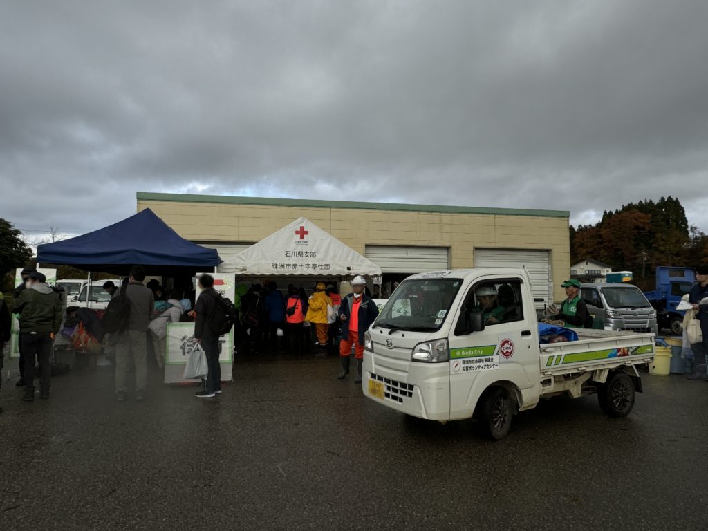 奈良県防災士会の活動に参加するため、防災士会のビブスを着用し、Y氏と珠洲市災害ボランティアセンター 近くの体育館駐車場 へ…