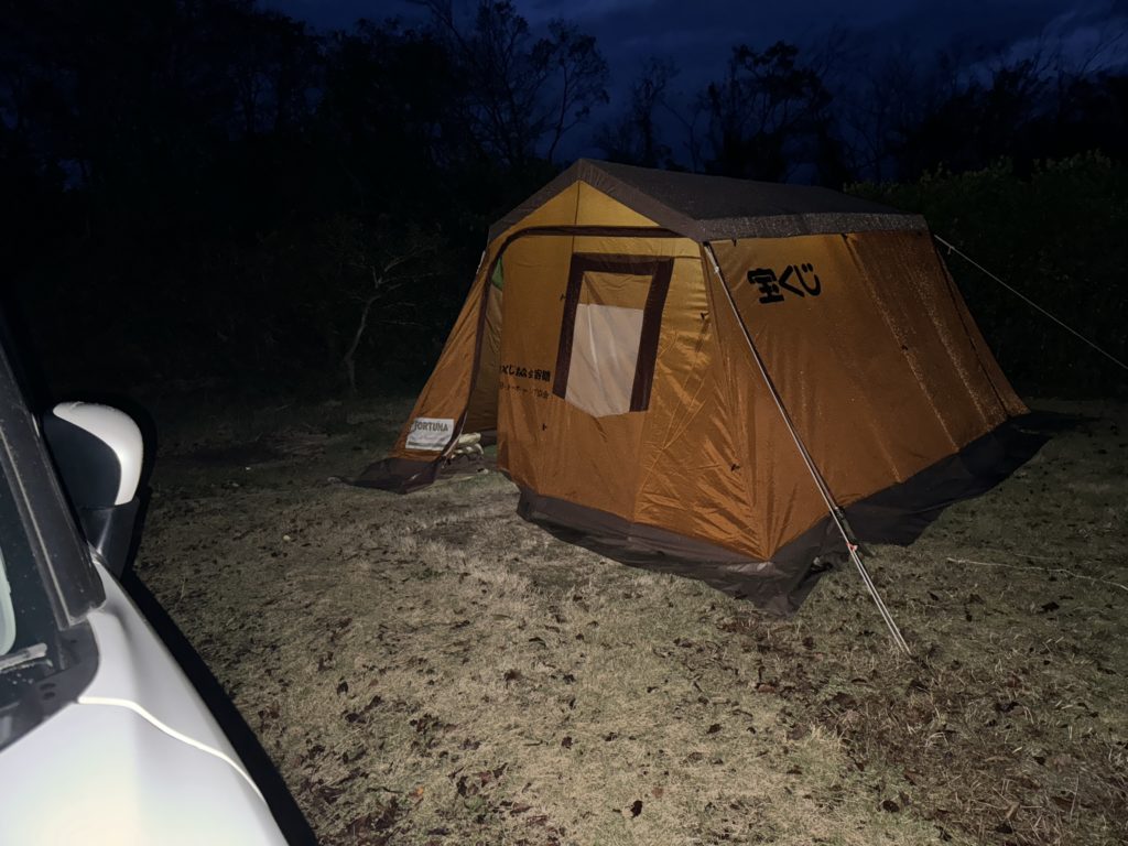 到着すると、すでにY氏がテントサイトを頼んでいただいていたので、車に装着していた吊り下げライトをテント内に吊り、後は荷物を入れるだけ…