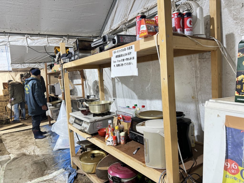 交流テント内では、男性が差し入れ?のお米でご飯を炊いた在り、女性は鍋をこしらえたり、お酒も入りそれぞれが夕食と懇談…ボラ先で頂いたのか、たくさんのお芋…ストーブで焼いて頂いた😋