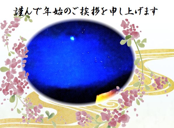 賀詞はなく、上半分につかの間晴れたボラキャンテント泊夜空の撮影画像…オリオン座近くにひときわ輝く木星ジュピター…平原綾香さんの復興への祈り…