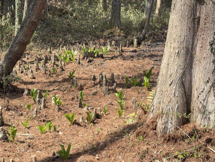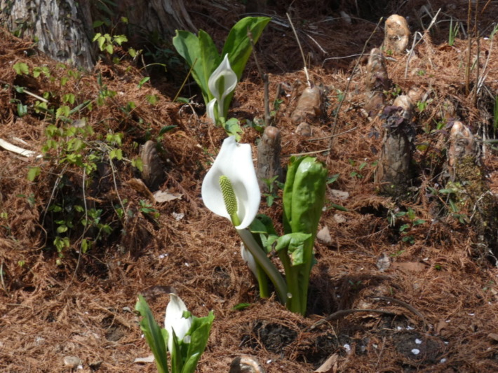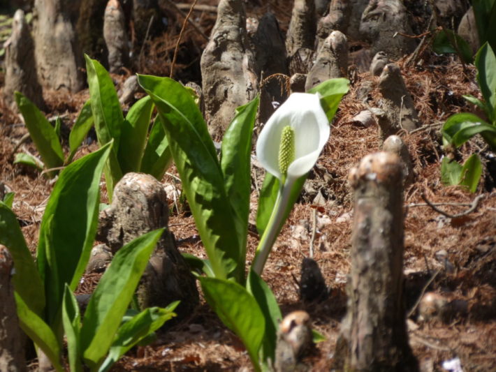 呼吸根(膝根)ぼこぼこの間に、ミズバショウ(水芭蕉)…尾瀬のイメージとは程遠いけど…