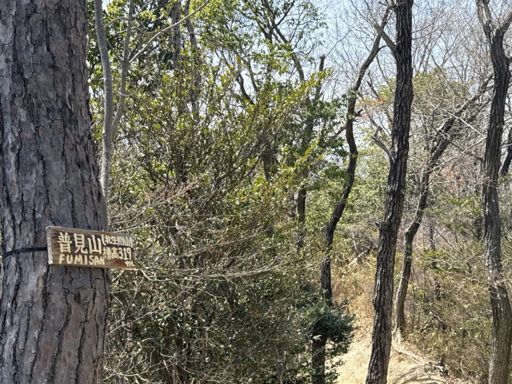山頂標は少し下方の木に…「普見山」(ふみさん)と別名「北生駒山」標高319m