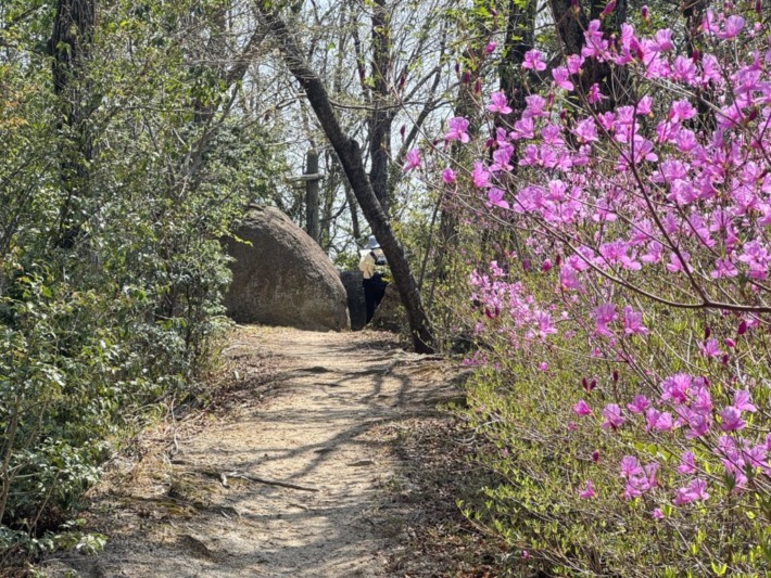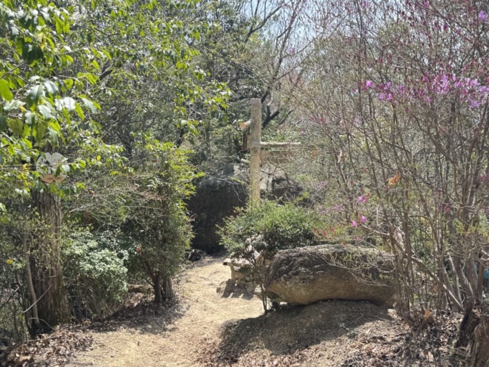 ミツバツツジ咲く心地よい尾根筋を下り行くと、「木立の大石」分岐…