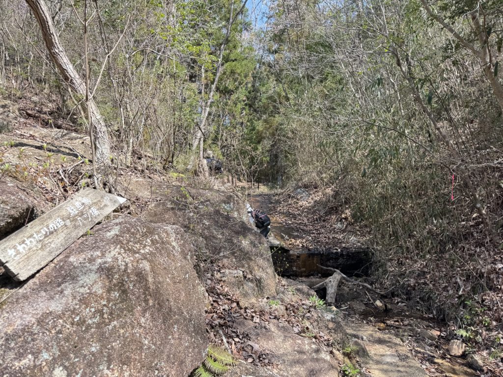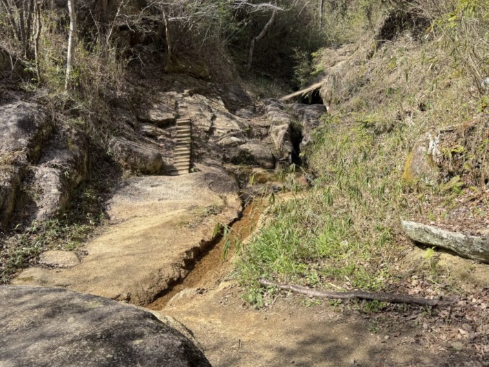 小滝や甌穴(おうけつ)の見られる岩場をくねくね登り行く…この先、小滝を撮影しよう藪に入ると、後ろから声…手を振るご婦人方に再開😅