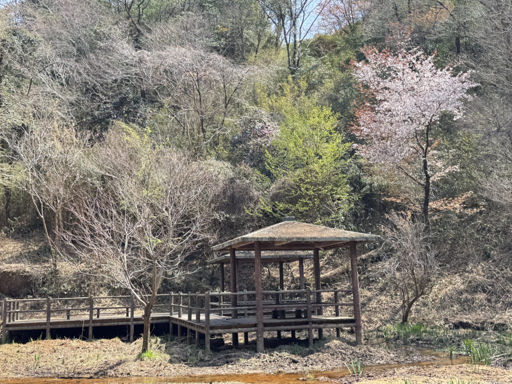 ウッドデッキに大樹が木陰を広げる休憩所…今はシダレザクラが彩を添えてる