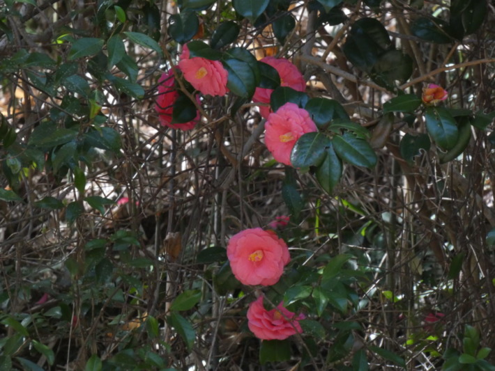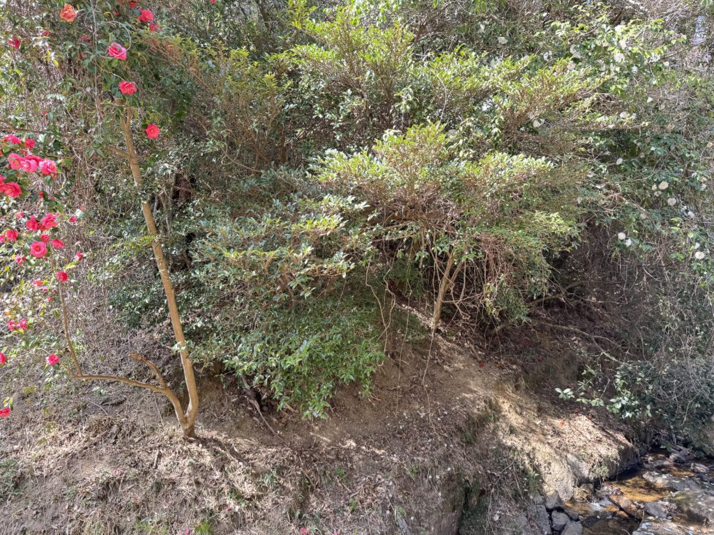 休憩所の向かい側、流れの山側にたくさん花を咲かせているツバキ…群落みたいにたくさん見えるが野性のヤブツバキ(薮椿)だろうか…