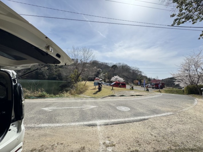 のんびりと釣り糸を垂れる釣り人の向こう、いつものように石灰で区画された路肩に駐車… 府民の森「くろんど園地」南側入り口に最も近い場所…そこからハイキングスタート♪