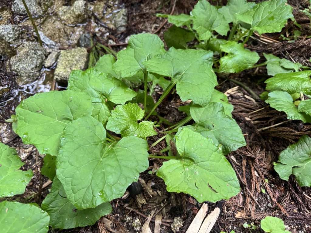 流れの際に群生…ワサビっぽい葉…ノブキ(野蕗)かな?