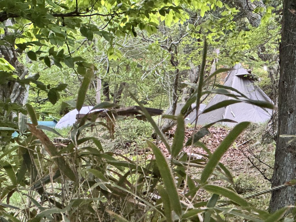 念仏坂に差し掛かる右手…柵に向こうのキャンプ場に幾つかテントがならんでいる