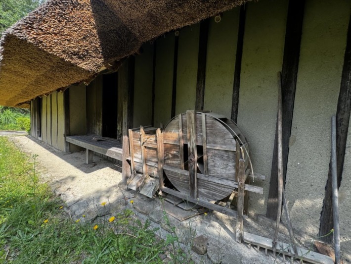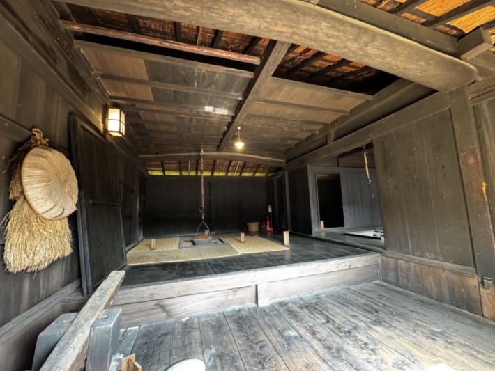 画面右下の、足で踏む杵つき装置などの作業場が土間ではなく板張りで壁もすべて板張り、かまどはなく囲炉裏で煮炊きした、この地方特有のしっかりした造作の古民家で、幕末に村役を務めた農林業の方の住まいだった、との事