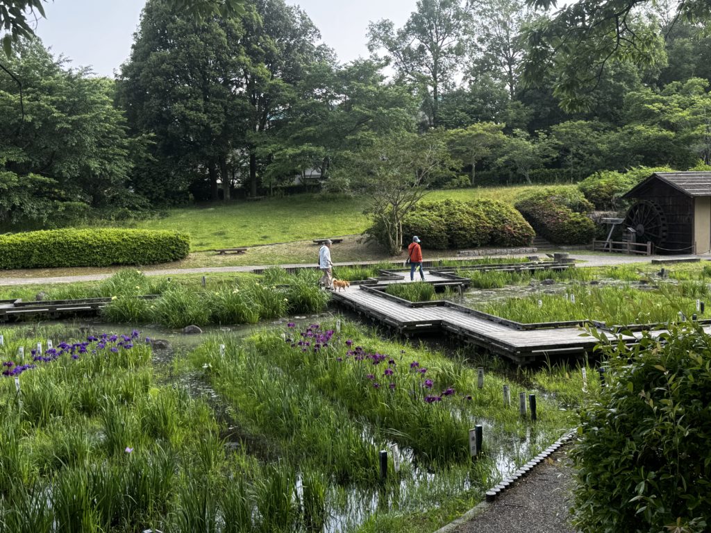 数少ないがハナショウブ(花菖蒲)咲く木道をワンちゃんもくねくね…