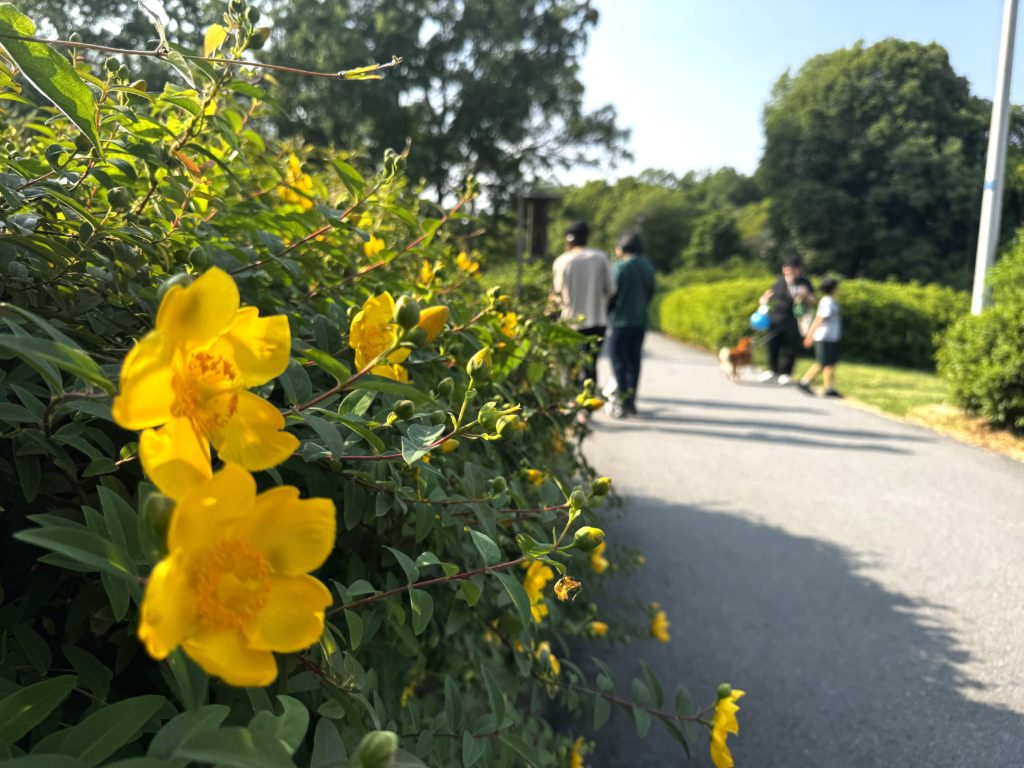 鮮やかな黄色の花垣のそばを三々五々、ワンちゃん連れの方々が行き交う…