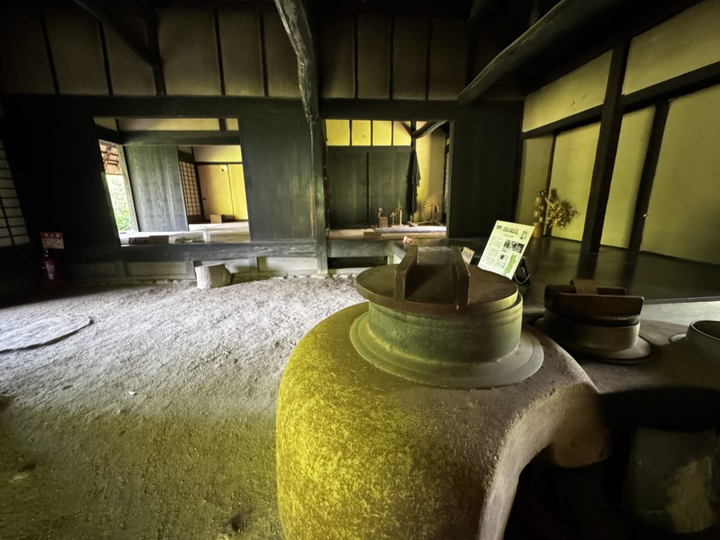 画面右下の、足で踏む杵つき装置などの作業場が土間ではなく板張りで壁もすべて板張り、かまどはなく囲炉裏で煮炊きした、この地方特有のしっかりした造作の古民家で、幕末に村役を務めた農林業の方の住まいだった、との事