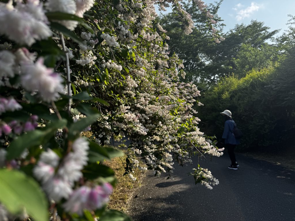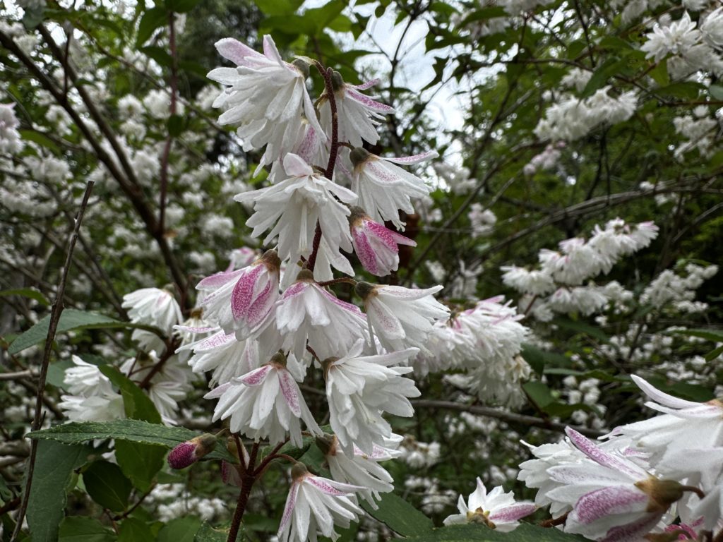 ウツギの八重咲き品種だが、蕾や開花した花弁裏の紅紫色が白と相まっておしゃれだね
