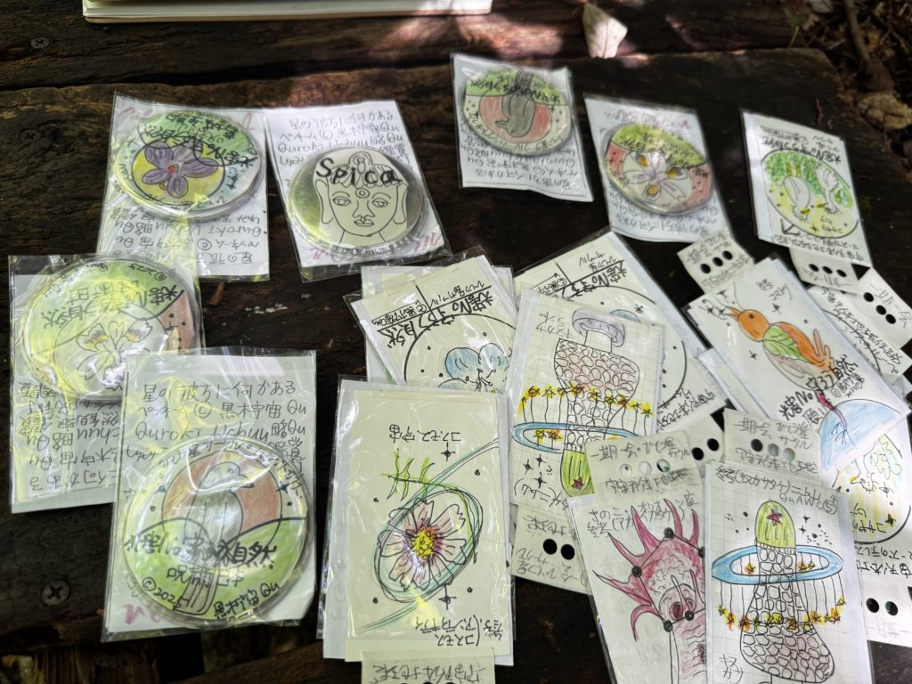 “一期一会の出合いに感謝"と、手作り缶バッチと花や星、キヌガサタケなどをアレンジした絵のカードを無償提供…絵の吊り下げ仕様にしたアーティストトレーディングカード(ATC)を無償提供…缶バッジとカードを頂きました🙇♂️