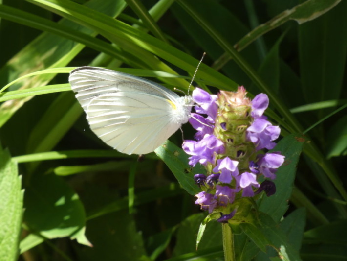 モンシロチョウが留まる花穂…よく見ると兜のような上唇の唇形花が面白く、チョウはそこを覗き込むようにして蜜を吸っている