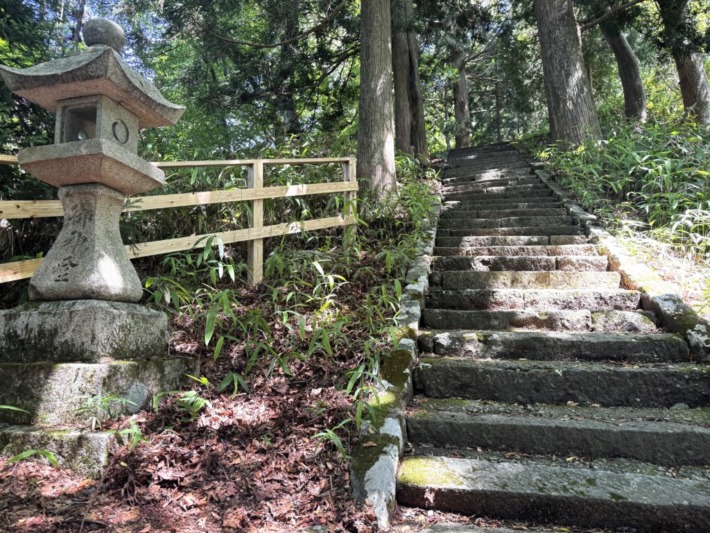 🔹再び神社に戻り、高龗神社北側の長い階段を下り行く…が、下の鳥居に近い段差の異なる石段で躓き灯篭側に転倒…