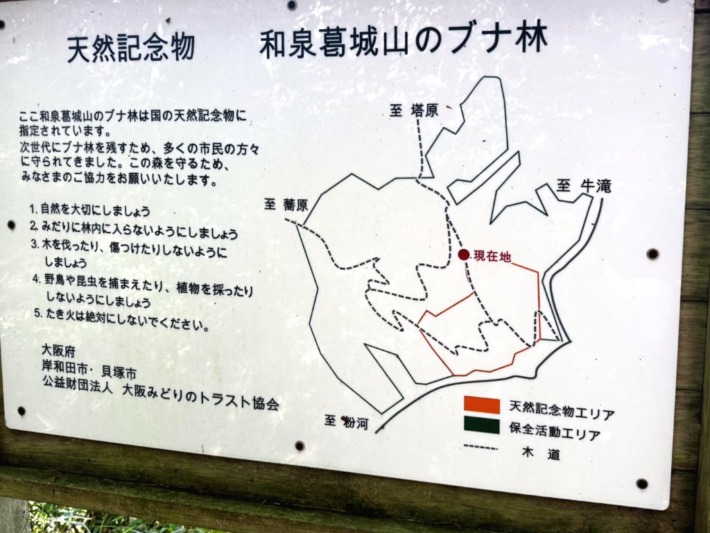 神社のある山頂の北側の比較的狭いエリアは、大正時代に「和泉葛城山ブナ林」として認定された「国指定天然記念物」