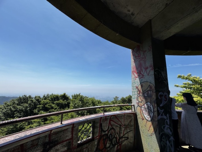 すぐに落書きだらけの展望台..登ってみたが、遠くは霞…(和歌山市方向)