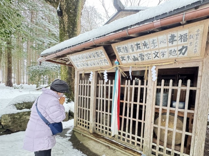 絶え間なく降り続く雪…トイレのある向こう側出入口からぐるっと一周して戻り…重たげに竹がしなる「座禅草群生地」を離れ、蛇谷ヶ峰(小椋栖山)東側の里、高島の天満宮へ…