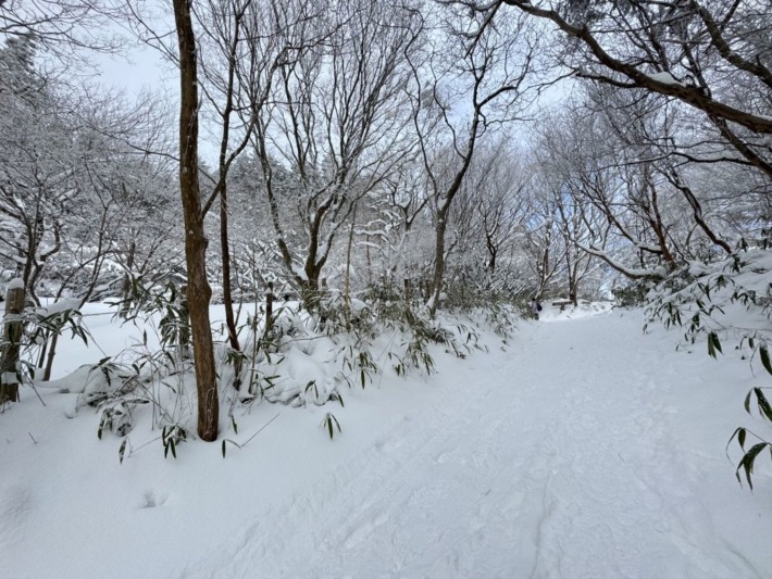 遊歩道は3~40cm程度の積雪..管理の方?か、先を行かれる方が雪を踏み固めてくれた…が、ところどころ竹が折れて道をふさぎ難儀…