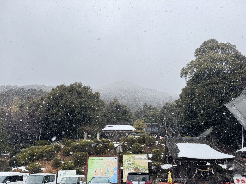 多くのお社が立つ上方、比良山地につながる「近江白坂」のある背後の山も雪霞みの中…