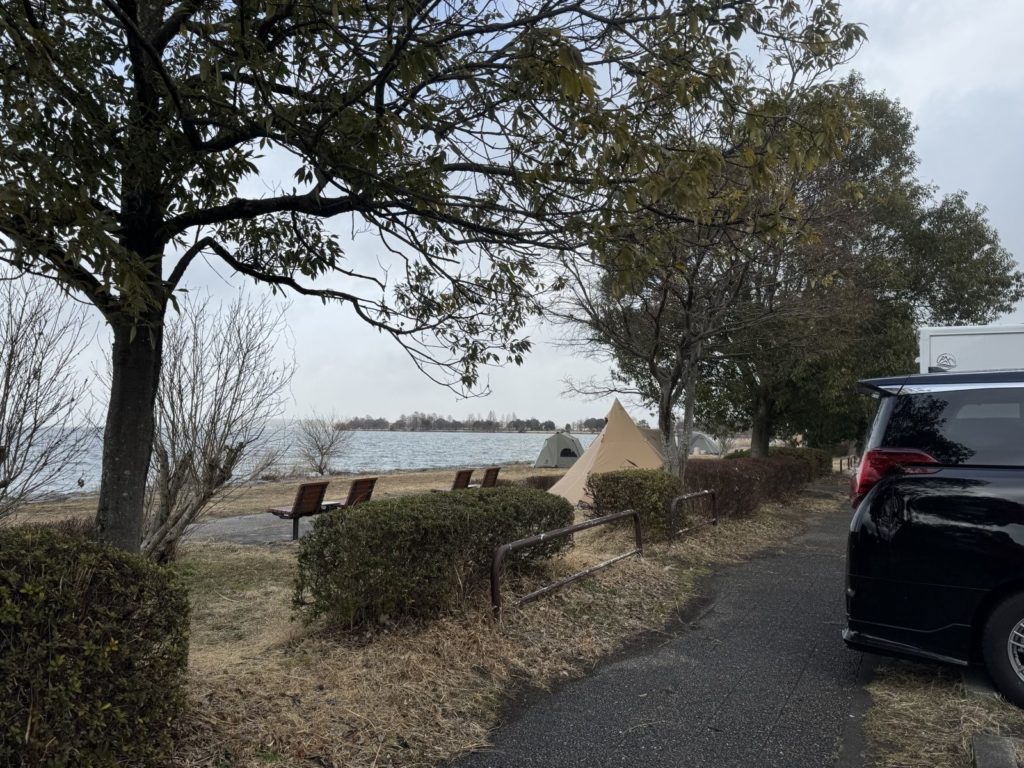無料で、ところどころトイレも設置されている湖岸緑地..多くの方が、比良や比叡方面を眺めつつ、冬キャンプを楽しまれている