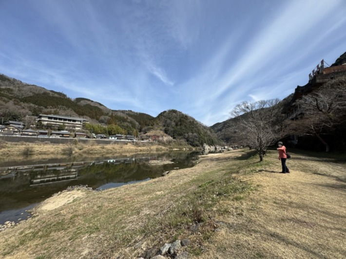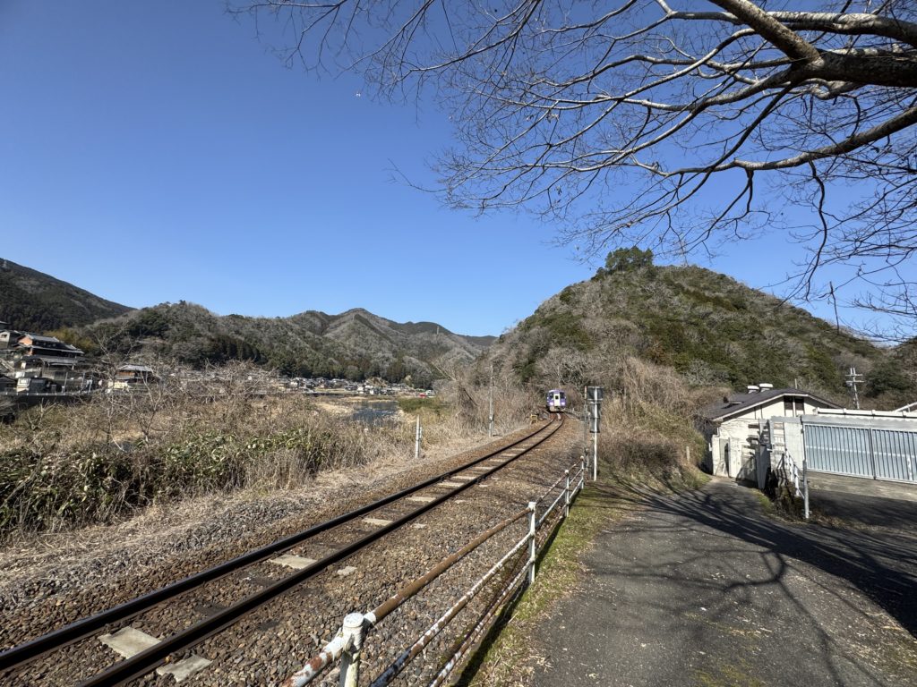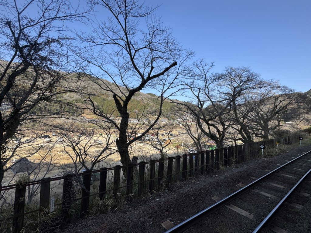 ホーム沿いと下のキャンプ場グラウンド側にも桜並木でもうすぐ美しい景観に…「笠置さくらまつり」3月29日(土)が楽しみ🌸🌸 今回の歩行距離片道2kmで…昼食の " 食べログ "