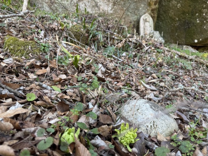 大岩に立てかけた石仏のあたりに、春の息吹き…ここを過ぎた先に🚻への標識と石段…