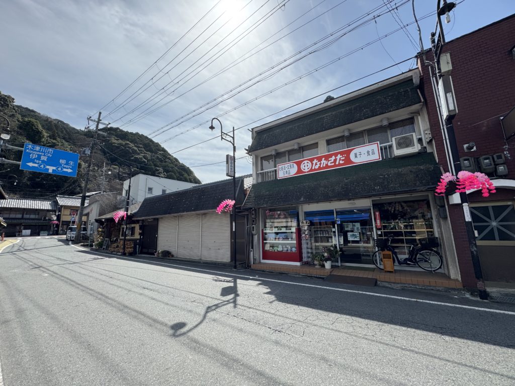 閑散としたメイン通りを笠置大橋方向へ…「笠置さくらまつり」の準備で、通りの屋並みに華やかな飾りがセットされている