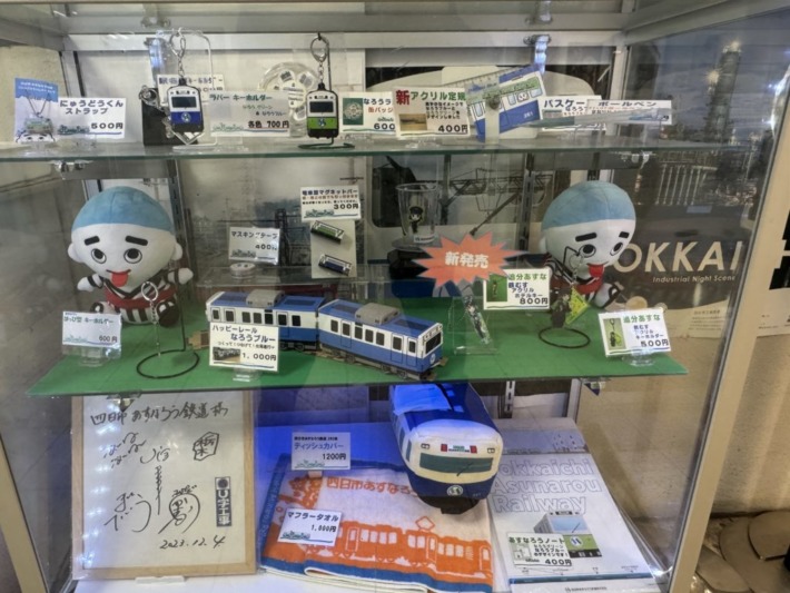 色んなグッズが販売されている…人形は.四日市市のマスコットキャラクター「こにゅうどうくん」