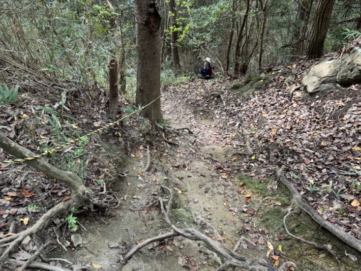 🔸ベンチ先の分岐を、右手の少しきつい新サンドイッチ山コースへ…(左のルートは、池までほぼ緩い下り)