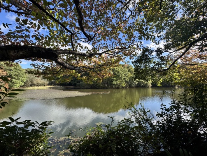 白旗池堰堤は秋の風情…