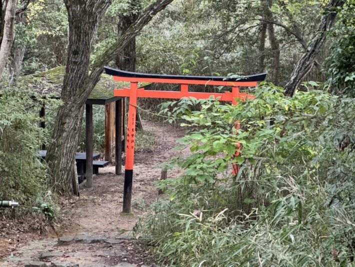 振り返ると、「交野いきものふれあいの里」 駐車場からのルート合流点に、たぶん二の鳥居とあずま舎…