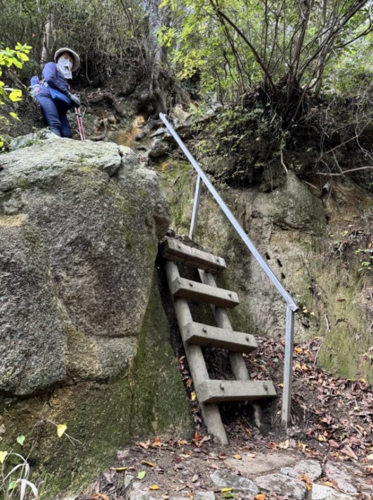 参道(登山道)はすぐにくさりもある岩場登りだが、階段や手すりがあり、北の急登階段より楽楽々♪