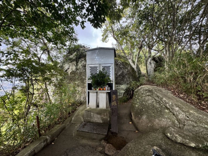 最上の⛩をくぐり上がると、岩の前に仏・法・僧の三宝荒神が祀られているステンレス祠…🙏 傍の木に懸けた温度計は9℃