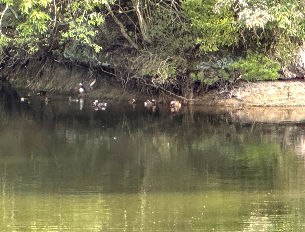 お目当ては一番奥、オシドリの集まる場所をターゲットに設置されてるフィールドスコープ… みえた!きれいなオシドリが、す~と視野を横切る…