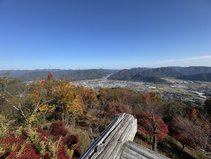 眼下に、山崎町の街並みを揖保川が流れ行き、屈曲して山あいへ…その先はたつの市、姫路市を抜け瀬戸内の海へ…