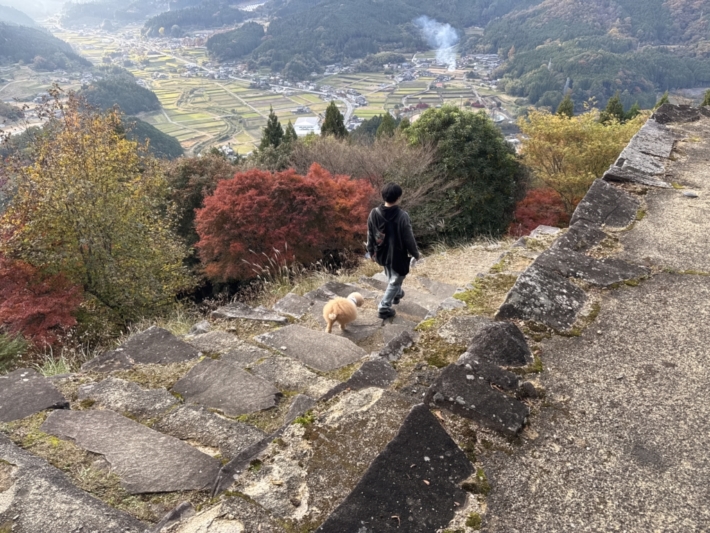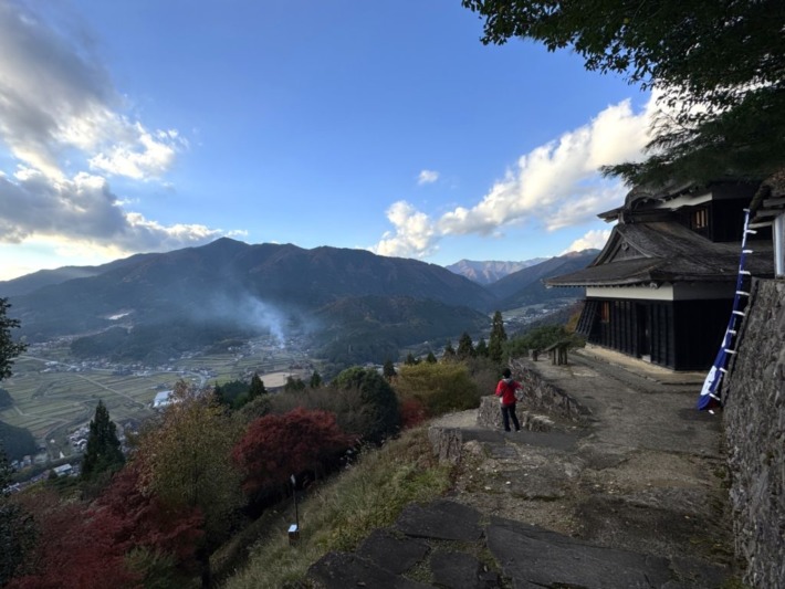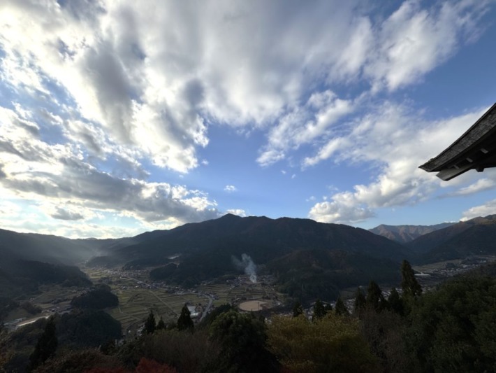 下山する眼下に、煙たなびく風情のある棚田…その奥にには、おそらく大甲山、荒尾山、植松山など1000mを越える宍粟50名山の山並みか…